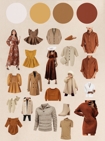 👉 Une harmonie bien pensée évite l’effet “tout pareil” (tout le monde en jean et t-shirt blanc) tout en gardant une cohérence naturelle.👉 Les palettes de couleurs apportent de la profondeur et de l’équilibre : tons chauds pour une ambiance cocooning, pastels pour la douceur, contrastes sobres pour l’élégance intemporelle.👉 Les accessoires (chapeaux, chaussures, gilets, noeuds) viennent compléter subtilement les silhouettes.